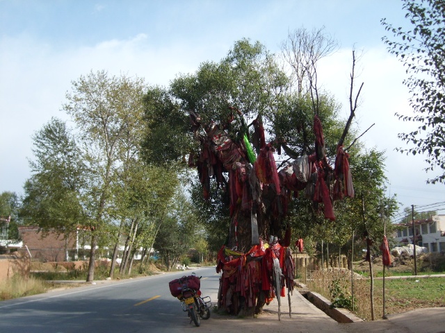 西宁到化隆省道上的一棵古树。其实这里大部分是回族居民,信奉伊斯兰教,这种类似于哈达的东西不知是不是回族的一种习惯。